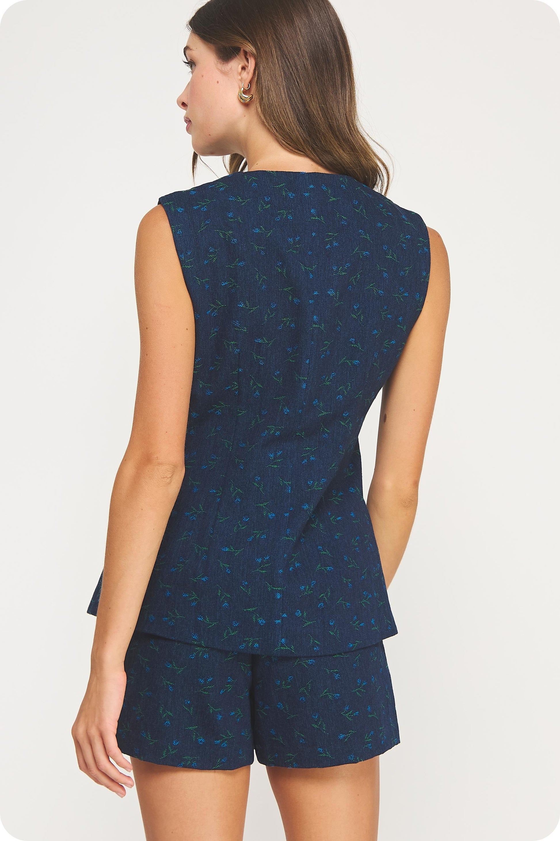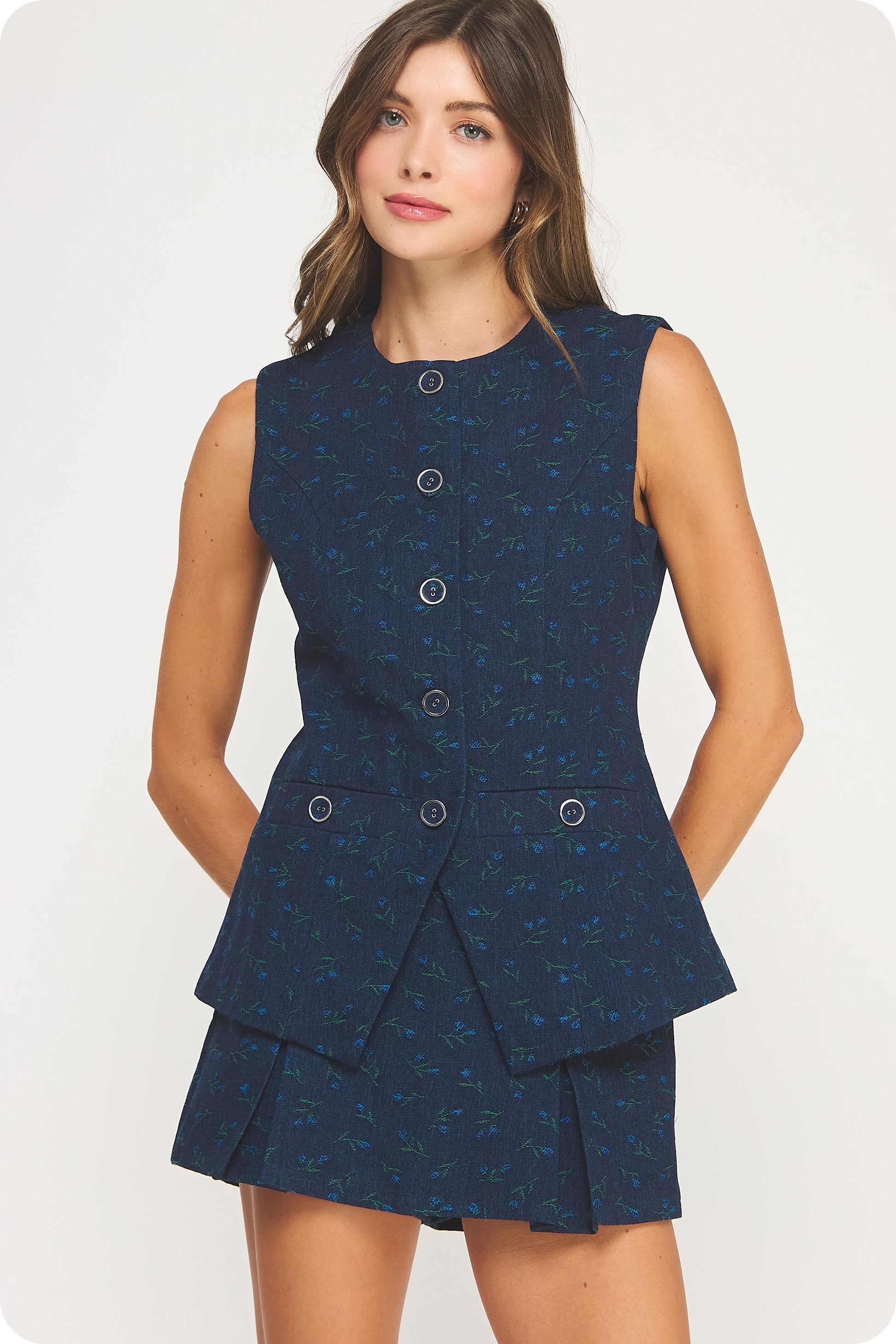 Front pleat detail mini skirt in floral print on denim fabric. This short skirt hybrid style features a front overlay with dual front pleat detail, welt back pockets, elasticated waist at back, and side pockets. It can be made into a set with vest
