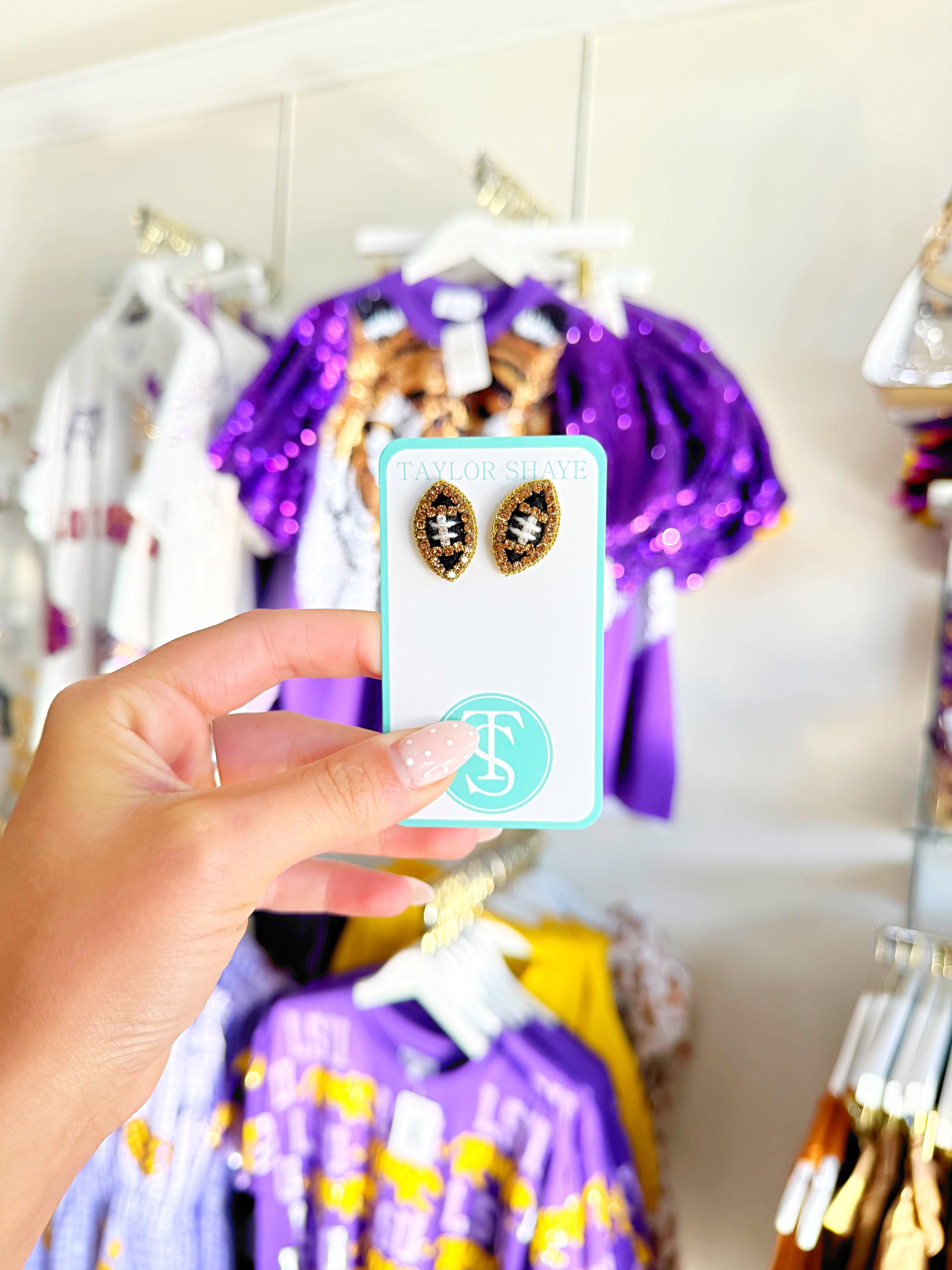 Elevate your gameday look with these stunning gold beaded football studs that blend athletic spirit with sophisticated style. Each stud features intricate beading that catches the light, making them the perfect accessory for fans who want to show their passion with elegance. Whether you're heading to the stadium or cheering from the sidelines, these eye-catching pieces add a touch of glamour to your gameday outfit. Lightweight and comfortable for all-day wear, they're designed to keep you looking polished from kickoff to the final whistle.