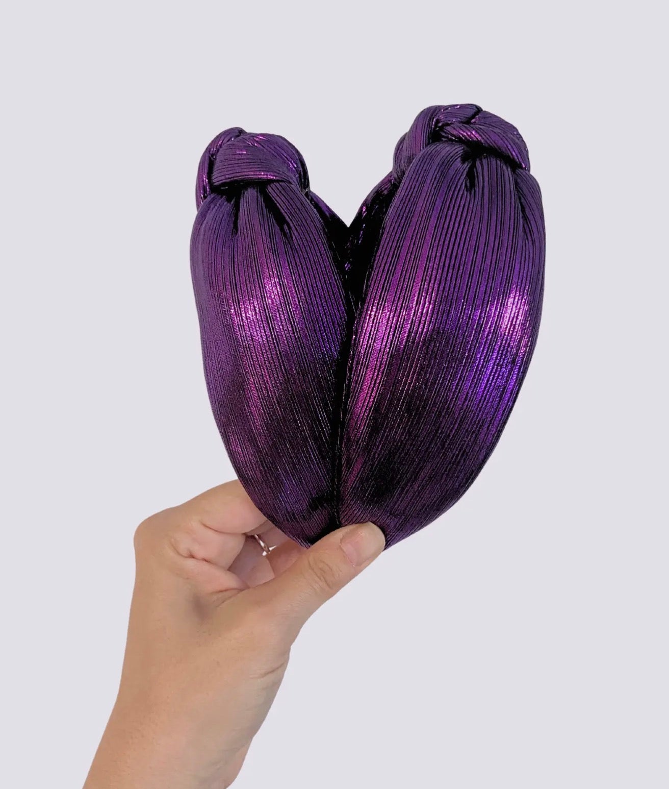 This metallic purple headband adds a touch of glamour to any outfit. Its sleek design and shiny finish make it perfect for any occasion. Made with high-quality materials, it provides both style and functionality. Elevate your hair game with this must-have accessory.