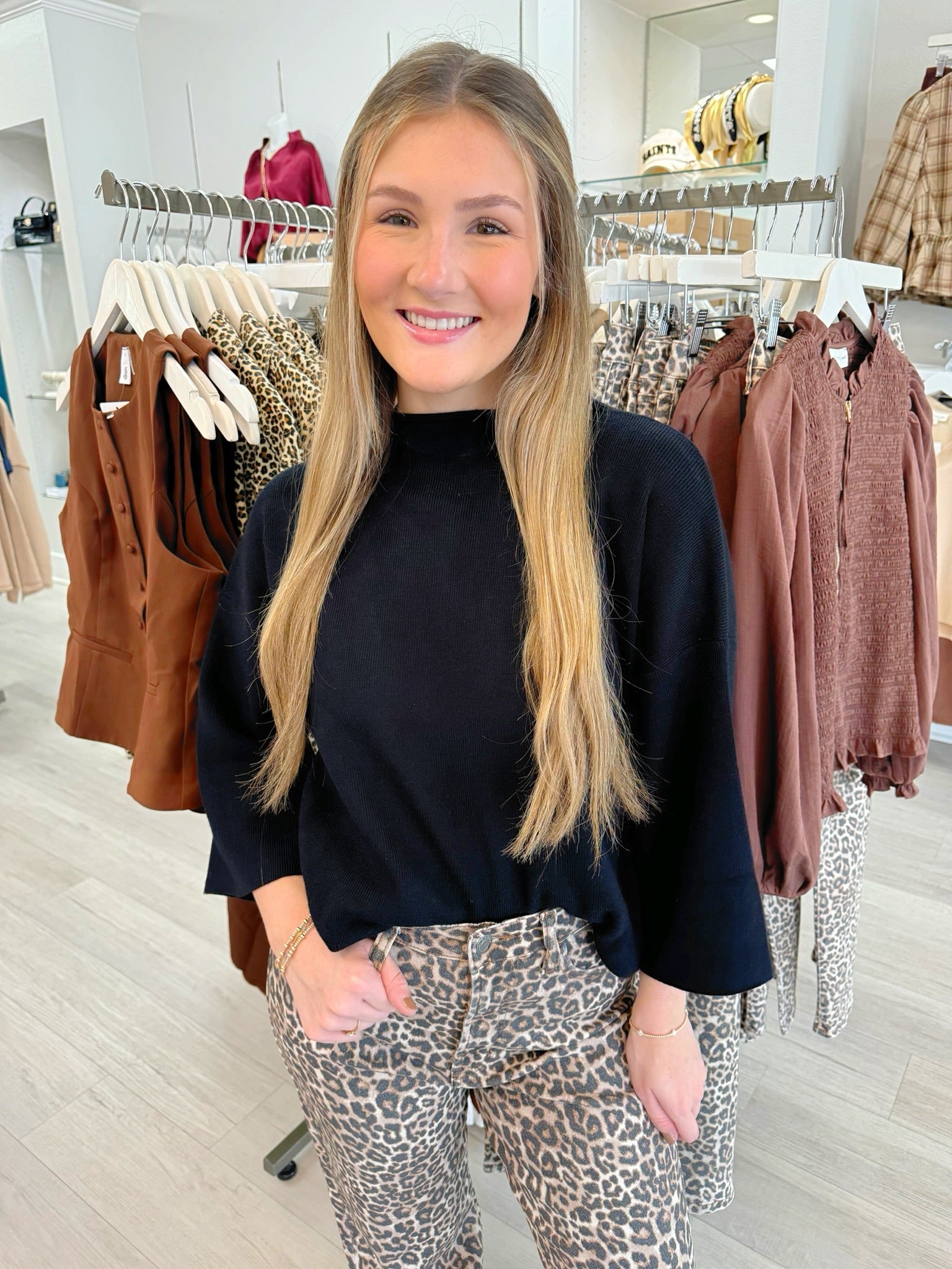 A festive twist on a timeless staple. This 3/4 sleeve mock neck sweater is soft, elegant, and perfect for the holiday season. The mock neckline adds a touch of sophistication, while the cropped sleeves make it ideal for layering or wearing on its own from day to night.
