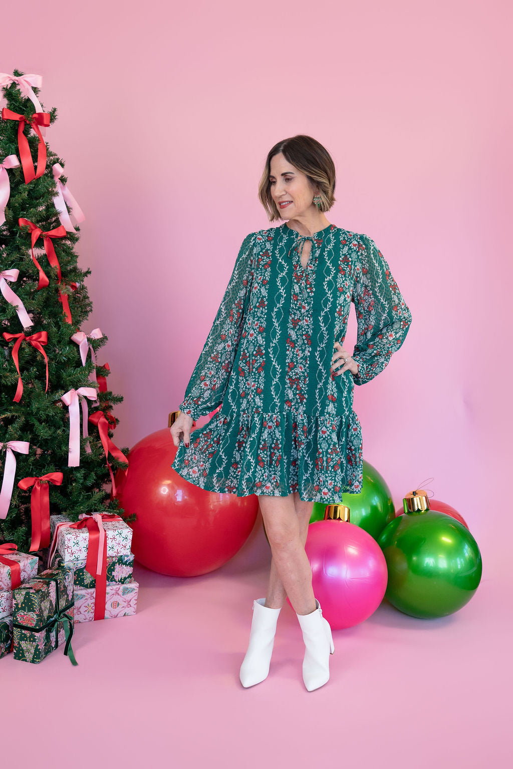 Celebrate the season in style with the Natasha Dress. Featuring long sleeves, a double placket, and a collar band with ties, this dress combines classic details with a modern edge. The tiered hem adds soft movement and festive flair, making it a perfect choice for holiday gatherings and special occasions.
