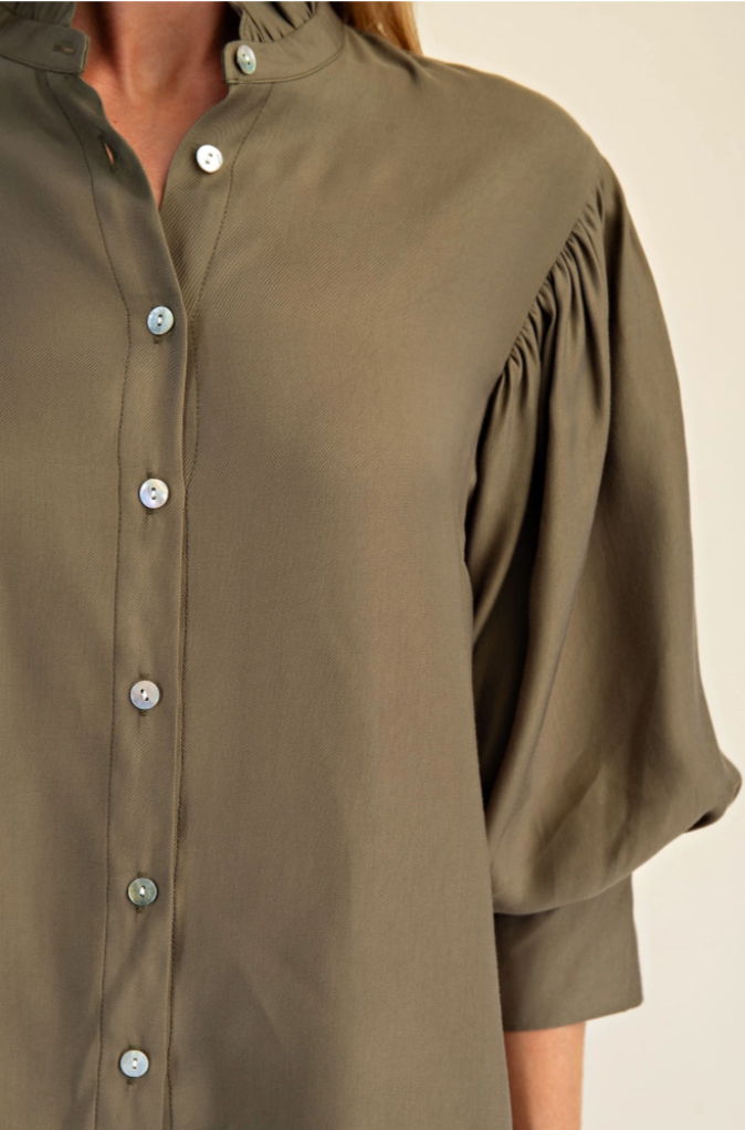 Elevate your everyday style with this adorable ruffle neck puff sleeve top. The delicate ruffled neckline adds a touch of feminine charm, while voluminous puff sleeves create a playful silhouette that's perfect for any occasion. Crafted for comfort and designed to flatter, this blouse pairs effortlessly with jeans, skirts, or trousers. Whether you're heading to brunch or a casual day out, this sweet piece brings instant personality to your wardrobe.