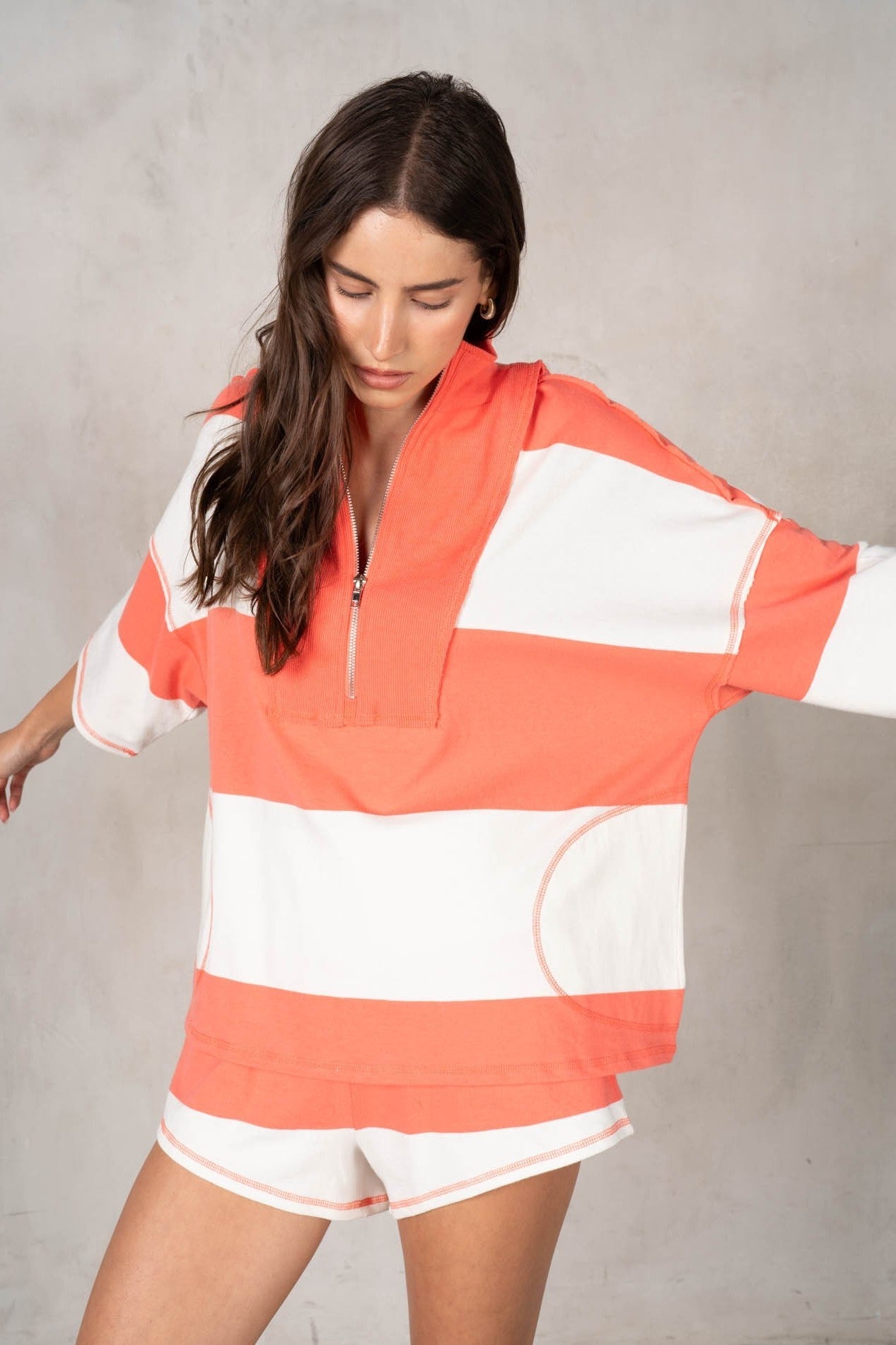 Stay comfy and cute in this brown striped lounge set! This two-piece features a relaxed oversized collared top with a quarter-zip detail and matching elastic waist shorts!